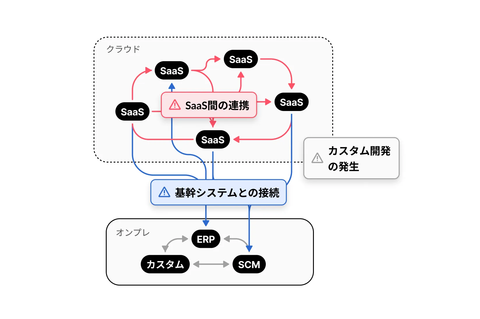 業務の全体最適を図るには、それぞれのタスクを効率化・自動化するだけではなく、タスクを起点に後続のフローまでサポートするような仕組みが必要になりますが、全体設計をせず領域ごとに細分化してSaaSを導入してしまうとデータやオペレーションが各ツールに散らばってしまい、結果として全体の業務コストが高まってしまうリスクもあります。